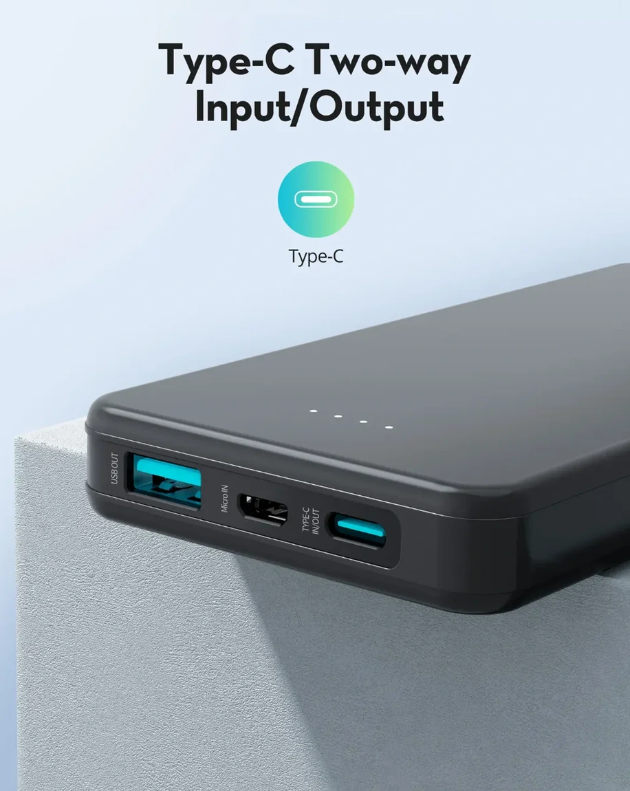 • Dual Inputs & Outputs: Micro USB + USB-C input, USB-A + USB-C output for universal compatibility.