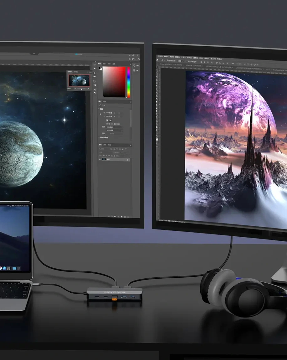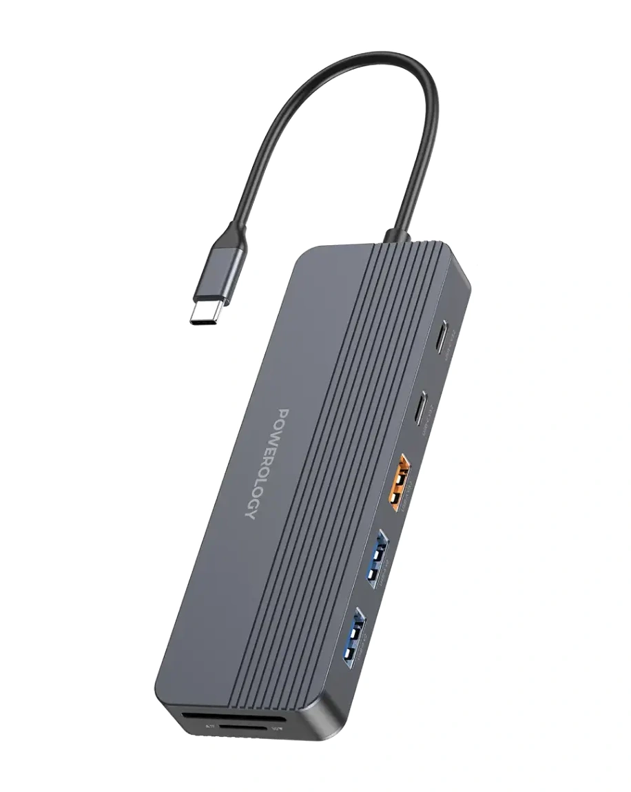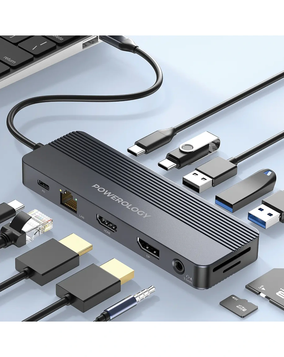 The Powerology 12-in-1 USB-C Multi-Port HUB is the all-in-one connectivity expander. Made from durable aluminum alloy with ABS, it strikes a fine balance between beauty and functionality. The hub supports dual video output through HDMI and DP, both 4K@60Hz class, and is therefore able to easily connect multiple displays. USB-C input supplies max power delivery at 100W and ensures pass-through charging for devices. Transfer rates of 10Gbps could be expected from USB-C and USB-A ports, and support SD card transfer at 480Mbps for microSD cards, which surely makes file transfer effortless. A 3.5mm audio and mic jack is provided for more ubiquitous audio needs. The Powerology HUB is universally compatible with Android, iOS, Windows, and Mac devices, thus supporting seamless plug-and-play functionality. Work, entertainment, or creative deviance; either way, this little hub can enhance your productivity by providing extra connectivity options for your devices.