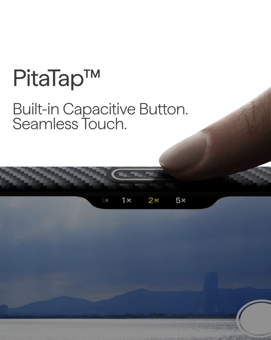 • A case under 1 mm thick shields the Camera Control Button with aramid fiber, while a hidden capacitive layer lets you tap and slide effortlessly. Seamlessly integrated, it preserves the aramid texture for precise, responsive control.