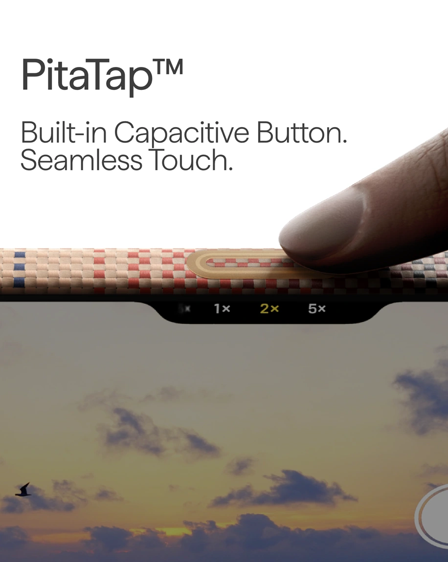 • A case under 1 mm thick shields the Camera Control Button with aramid fiber, while a hidden capacitive layer lets you tap and slide effortlessly. Seamlessly integrated, it preserves the aramid texture for precise, responsive control.