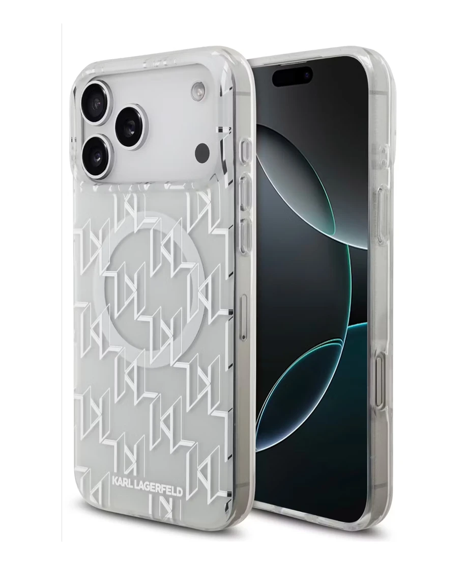 • The Karl Lagerfeld MagSafe IML Case with Karl Repeated Monogram Electroplated Design in White is the perfect blend of style, durability, and convenience for your iPhone 17 Pro Max. Because of its lightweight construction and soft grip, this case is easy to handle all day. Its thin form makes pocket storage simple without compromising security. For a truly convenient experience, the case works well with MagSafe accessories. This makes connecting smooth and easy. This accessory stands out with its unique electroplated Karl Lagerfeld monogram. It adds a touch of elegance and sophistication. The case has a snap-on design for a snug fit. It also offers drop protection to guard your device against accidental falls. Also, it is packaged sustainably, aligning with eco-friendly principles. This stylish, high-end case keeps your iPhone safe and secure. The Karl Lagerfeld MagSafe IML Case with Karl Repeated Monogram Electroplated Design improves both protection and appearance.