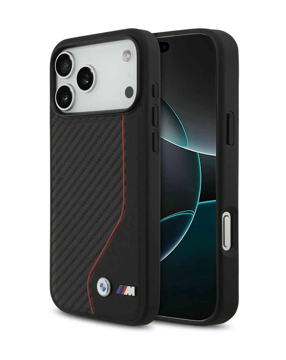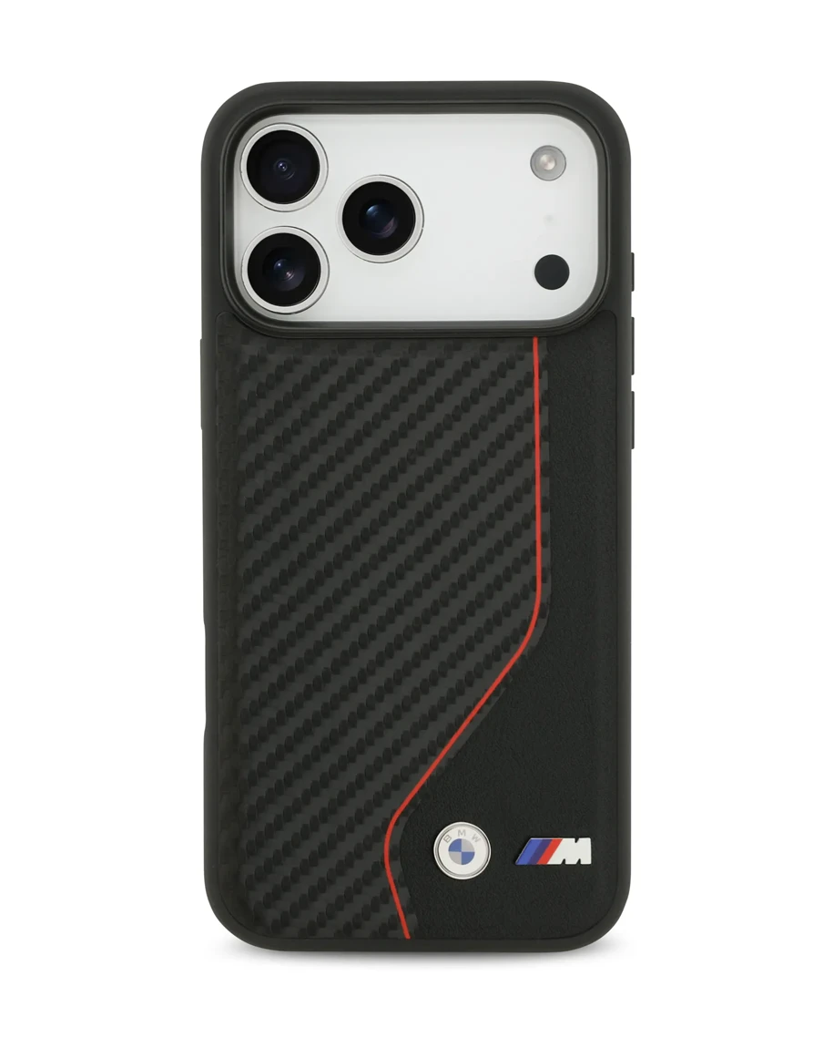 BMW iPhone 17 Pro Max Back cover case - PU Leather & Carbon Case With Red Line Stitch - Black