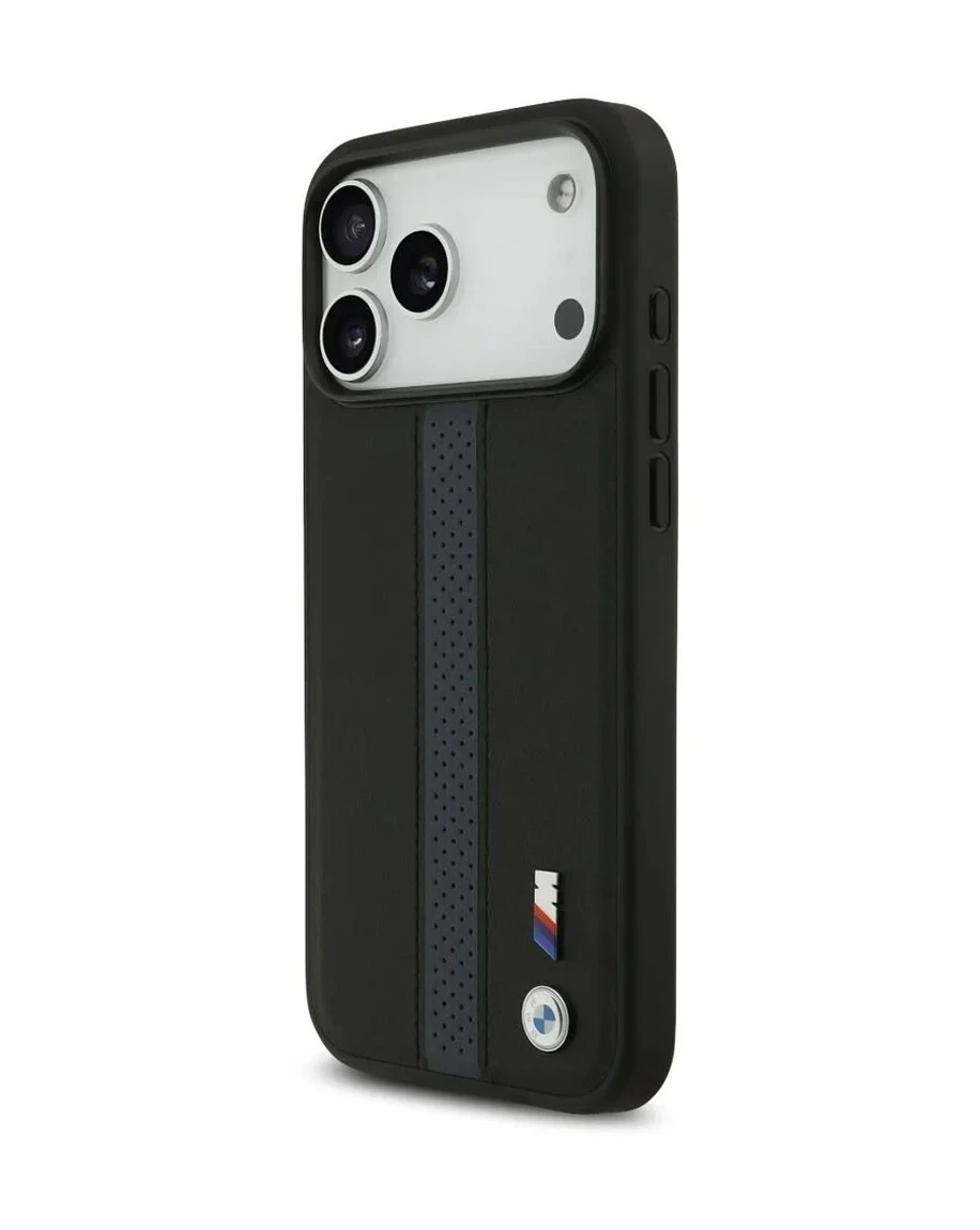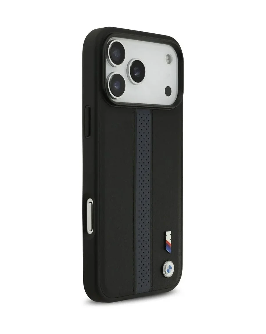 • The BMW PU Leather Case with Perforated Stripes & Metal Logos in Black/Blue Color for your iPhone 17 Pro Max combines elegant style and superior protection. This case is made from high-quality PU leather. It has a lightweight and slim design, so it offers reliable drop protection. It's nice to hold because of the trendy perforated stripes. They make it look good and provide a better grip. With its recognizable BMW metal emblem, this case gives your gadget a luxurious touch. MagSafe compatibility and easy snap-on installation let you connect accessories quickly. This includes chargers and mounts. The sustainable packaging of the case demonstrates BMW's dedication to environmental stewardship. The BMW PU Leather Case with Perforated Stripes & Metal Logos offers your iPhone strong protection and a sleek look. It's perfect for those who want both style and function.